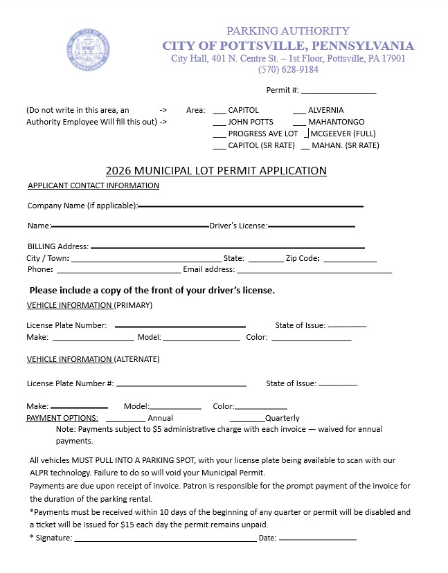 - Payment of $50 (cash or check to the Pottsville Parking Authority) is due on the issuance of the Residential Parking Permit. The Residential Parking Permit is not prorated. The Residential Parking Permit is valid until June 30, 2026. Residential Parking Permits are renewed annually upon presentation of satisfactory documentation. Payment is not refundable. You will receive a Residential Parking Permit upon receipt of payment.
