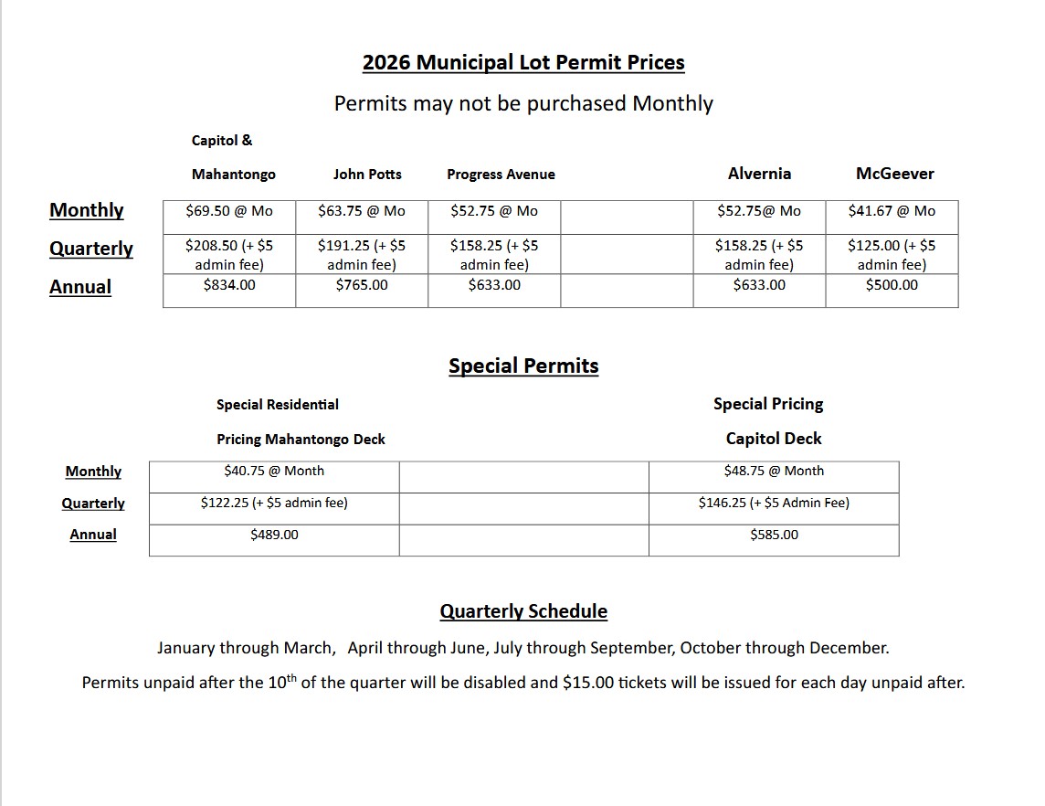 - (These residents are entitled to park at Mahantongo Deck @ the reduced Residential Mahantongo Deck Quarterly rate of $122.75 plus a $5.00 Administrative Fee)