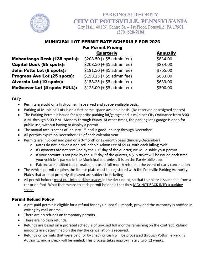 - Payment of $50 (cash or check to the Pottsville Parking Authority) is due on the issuance of the Residential Parking Permit. The Residential Parking Permit is not prorated. The Residential Parking Permit is valid until June 30, 2026. Residential Parking Permits are renewed annually upon presentation of satisfactory documentation. Payment is not refundable. You will receive a Residential Parking Permit upon receipt of payment.